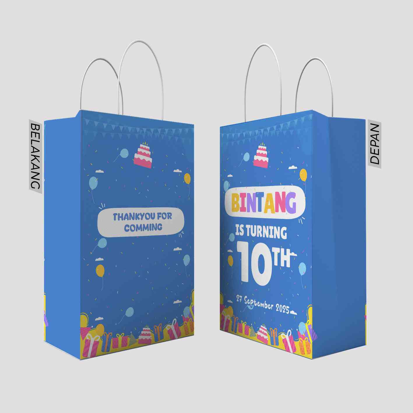 Kantong kado ini menggunakan tema biru cerah yang dipenuhi dengan dekorasi seperti balon, kue ulang tahun, dan berbagai elemen pesta. Di bagian belaka...