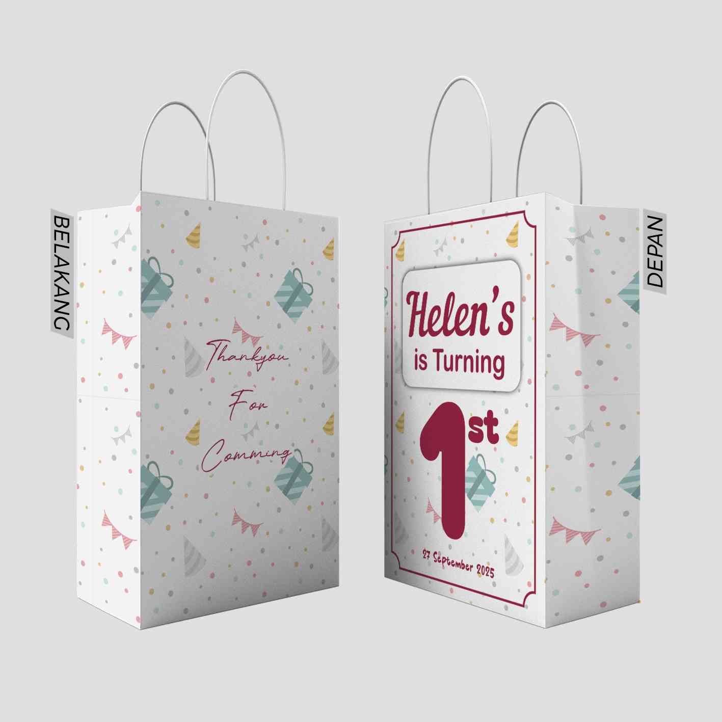 Kantong kado ini menggunakan tema kastil dan mahkota yang sangat cocok untuk merayakan ulang tahun anak perempuan. Dengan warna pink yang lembut, di bagian belakang terdapat pesan "THANK YOU FOR COMMING" yang dipadukan dengan desain yang elegan. Bagian depan kantong menunjukkan tulisan "PRINCESS IS TURNING ONE" dengan gambar kastil yang indah serta elemen bintang yang berkilauan, menciptakan nuansa kerajaan yang menawan. Desain ini sangat sempurna untuk merayakan ulang tahun pertama Princess dengan suasana magis, elegan, dan penuh kebahagiaan.