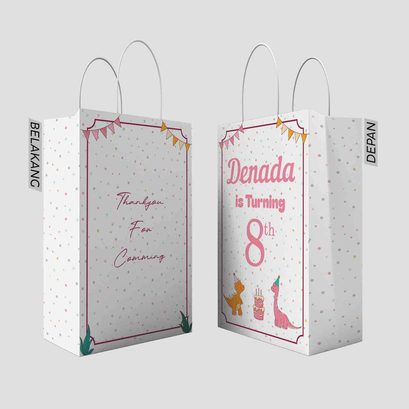 Kantong kado ini menggunakan tema warna pink yang lembut dengan elemen-elemen yang sangat ceria. Di bagian belakang kantong, terdapat tulisan "THANK Y...