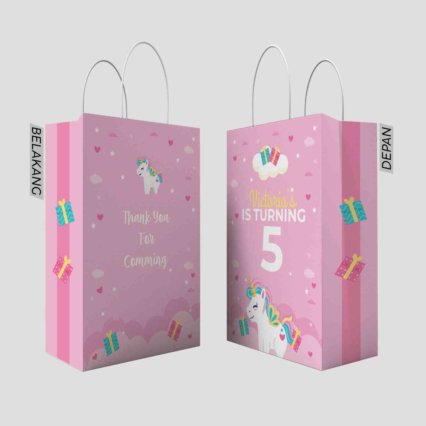 Tas kertas ulang tahun dengan desain lucu dan penuh warna ini sempurna untuk pesta ulang tahun anak perempuan yang berusia lima tahun. Di bagian depan...