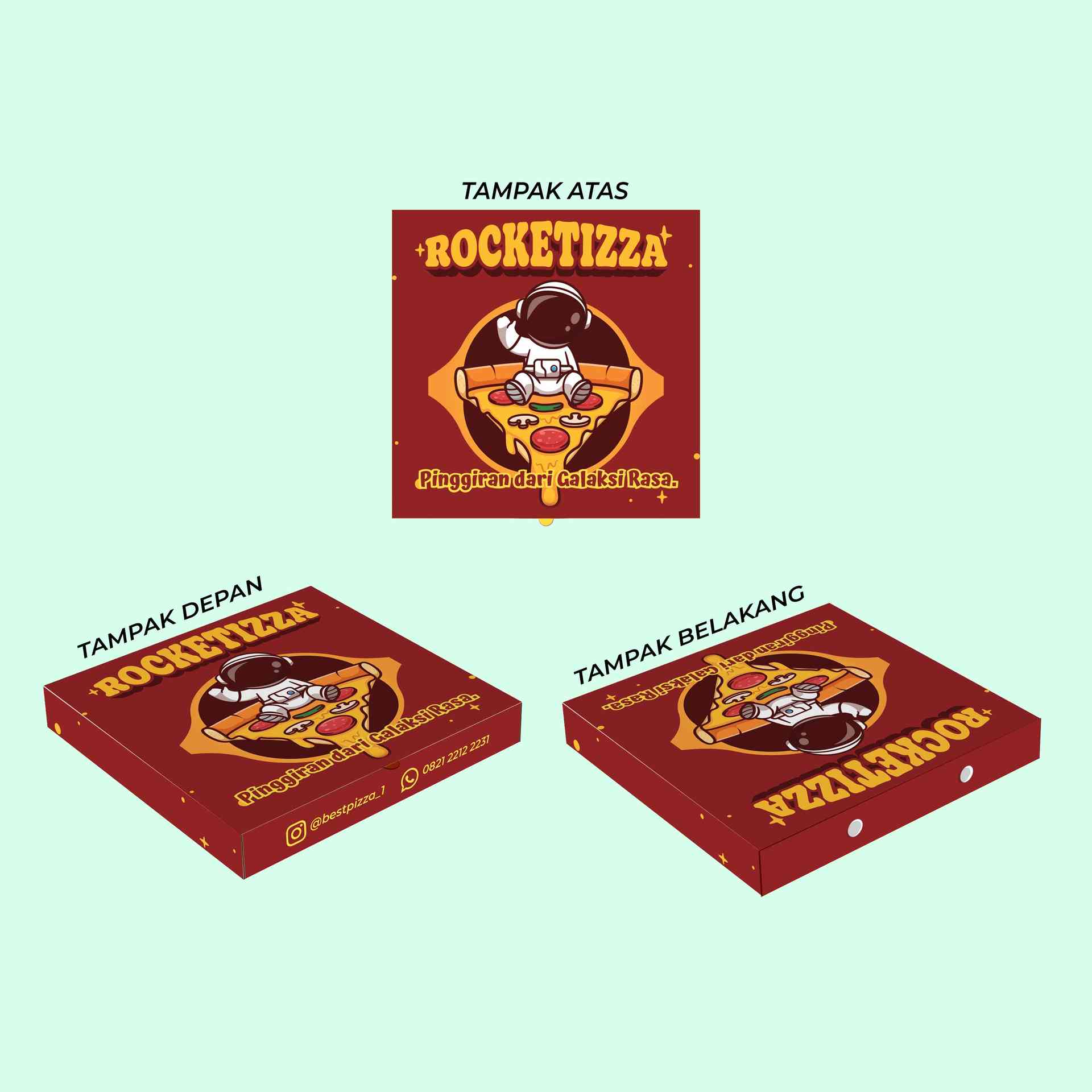 “Rocketizza” membawa konsep intergalaksi ke dalam desain kotak pizza. Ilustrasi astronot dengan pizza berbentuk roket tampil di tengah desain de...