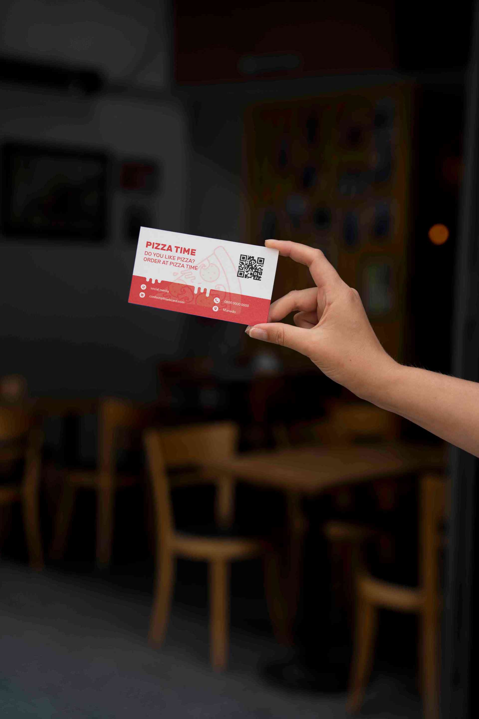 Kartu nama berbentuk persegi panjang dengan dominasi warna merah muda dan putih, menampilkan elemen visual berupa ilustrasi slice pizza transparan di...