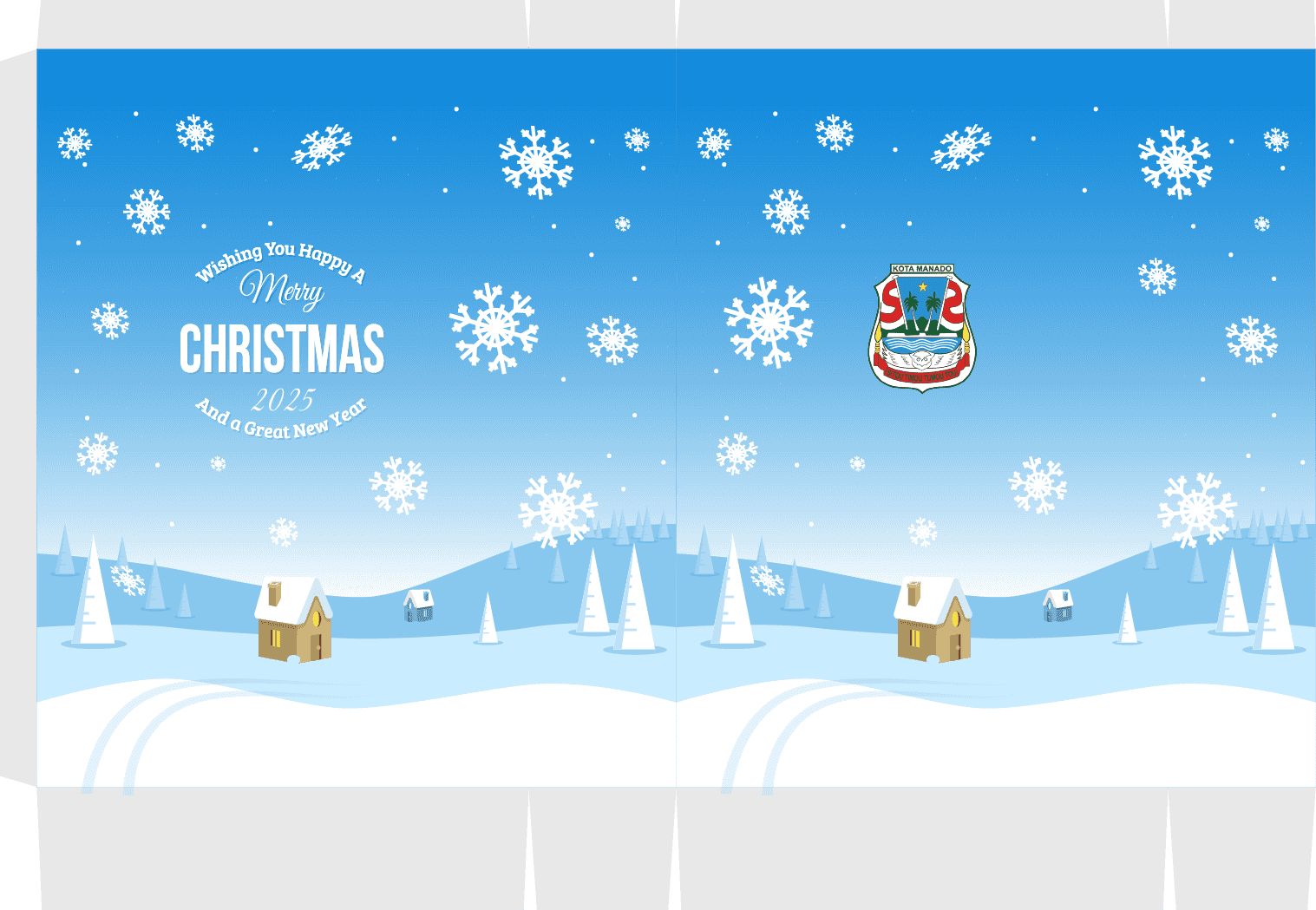 Paperbag Natal bertema nuansa biru ini menampilkan ilustrasi ceria dengan dominasi warna biru muda, dihiasi salju dan ornamen pohon cemara serta manusia salju berkostum Santa. Visual utama diisi dengan hadiah warna-warni, permen tongkat, dan pohon Natal berhias bintang sebagai pusat perhatian. Tulisan ucapan “Merry Christmas 2025 & Happy New Year 2026” di tengah memberikan nuansa perayaan akhir tahun yang hangat. Terdapat pula ruang untuk logo dan informasi kontak media sosial, menjadikan paperbag ini cocok sebagai kemasan promosi bisnis retail, toko hadiah, atau perusahaan untuk menyambut Natal dan Tahun Baru dengan kesan profesional serta ramah keluarga.