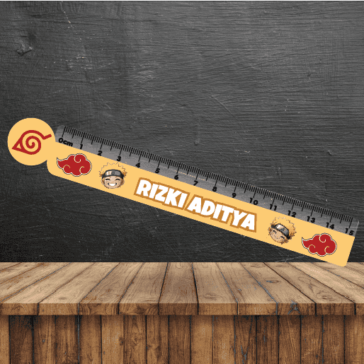 Penggaris karakter Naruto Kuning berbentuk lurus dengan ujung bulat, didominasi warna kuning cerah dan dihiasi gambar karakter Naruto serta simbol iko...