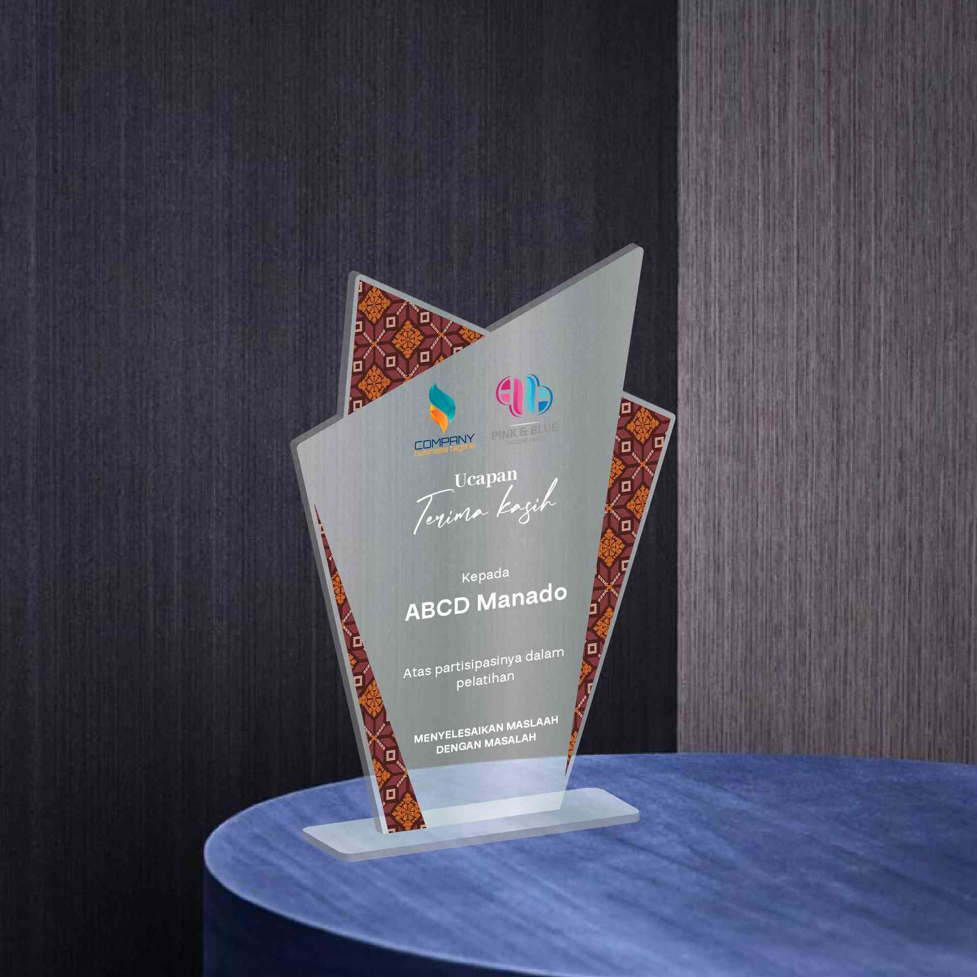 Plakat akrilik penghargaan ini memiliki desain yang elegan dan modern, dengan bentuk melengkung yang unik serta material akrilik berkualitas tinggi ya...