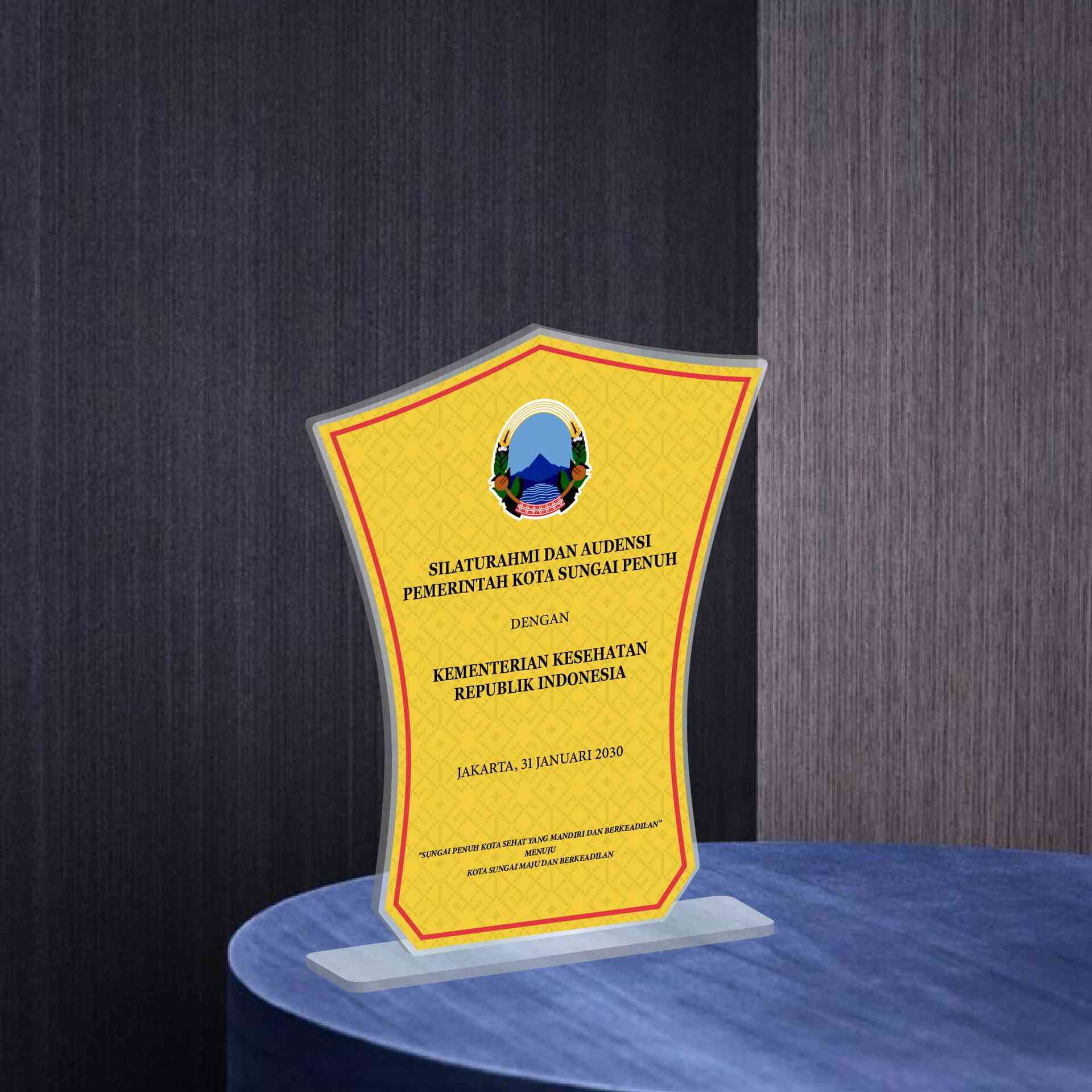 Dengan desain asimetris dan latar hitam bertekstur kilau emas, plakat ini tampil sangat kuat dan mewah. Kesan yang dihadirkan cocok untuk acara kompet...