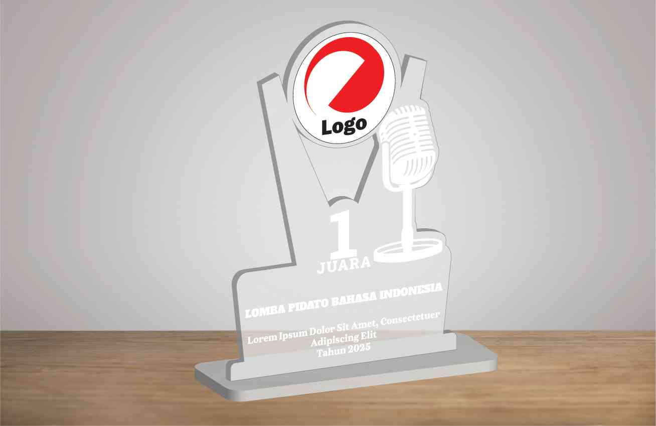 Plakat penghargaan lomba lari marathon dengan desain elegan berbahan akrilik transparan, menampilkan bentuk unik dengan elemen grafis modern. Diberika...