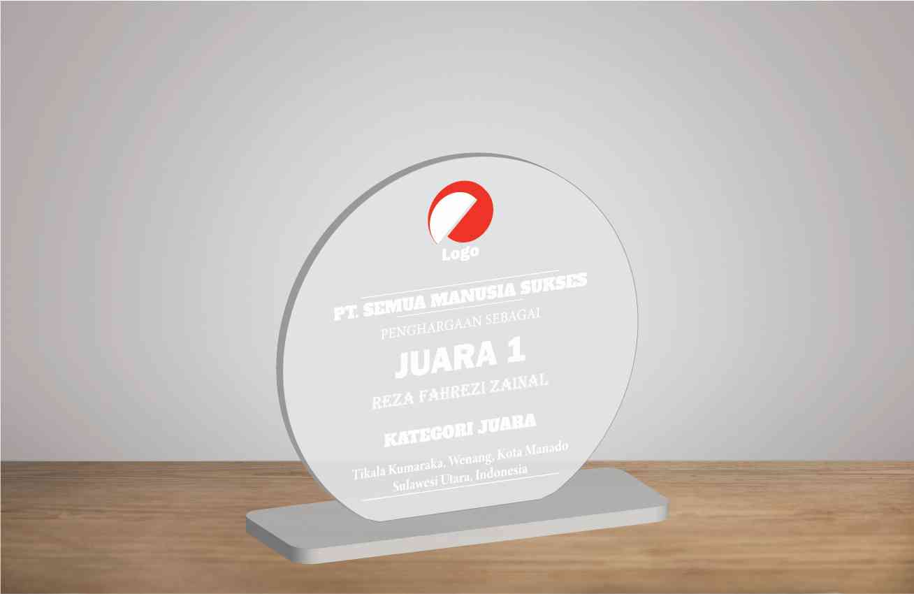 Dilengkapi dengan base akrilik tebal yang stabil, plakat ini ideal untuk dipajang di meja atau etalase penghargaan. Dengan desain yang dapat dikustomisasi, pelanggan bisa menambahkan nama penerima, logo event, serta detail lainnya sesuai keinginan.