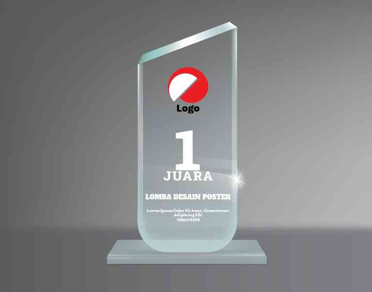 Dengan finishing transparan dan tepi yang dipoles halus, plakat ini tampak seperti kristal mewah yang memberikan efek reflektif saat terkena cahaya. Detail teks dan logo dicetak menggunakan UV printing atau teknik engraving yang memastikan hasil tahan lama dan tidak mudah pudar.
