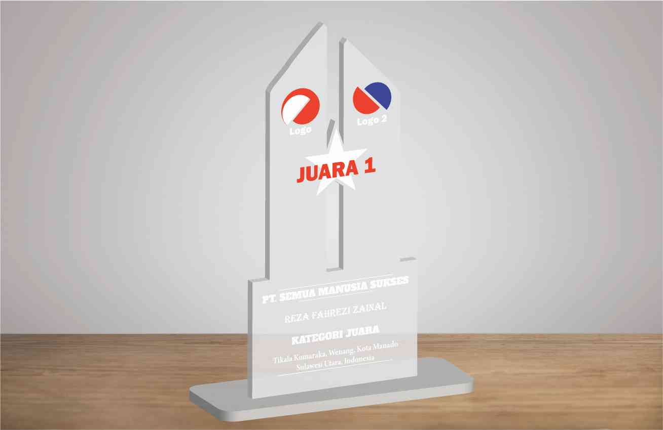 Plakat akrilik ini memiliki desain geometris modern dengan potongan asimetris yang memberikan kesan eksklusif dan elegan. Terbuat dari akrilik premium dengan ketebalan ideal, plakat ini cocok digunakan sebagai trofi penghargaan, hadiah juara, atau kenang-kenangan prestisius untuk berbagai acara kompetisi dan perayaan.