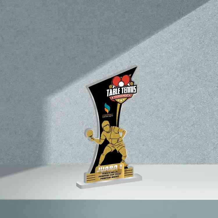 Plakat akrilik trophy juara tenis meja ini hadir dengan desain modern dan elegan, menggabungkan warna hitam dan emas yang menciptakan kesan eksklusif...