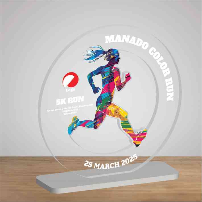 Plakat penghargaan lari marathon ini dengan desain elegan berbahan akrilik transparan, menampilkan bentuk unik dengan elemen grafis modern. Diberikan...