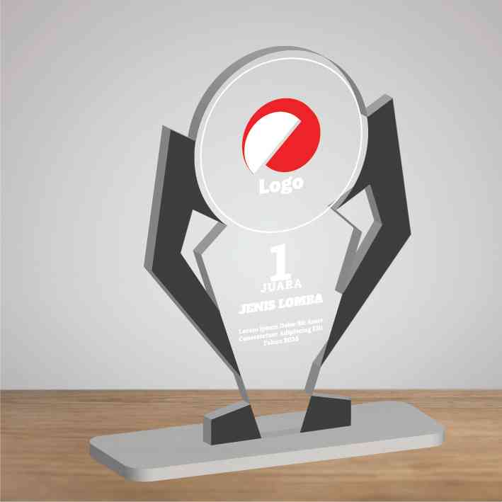Plakat penghargaan dengan desain elegan berbahan akrilik transparan, menampilkan bentuk unik dengan elemen grafis modern. Diberikan sebagai trofi juar...