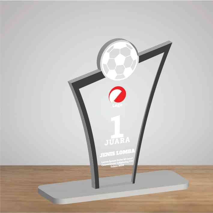 Plakat penghargaan lomba sepak bola dengan desain elegan berbahan akrilik transparan, menampilkan bentuk unik dengan elemen grafis modern. Diberikan s...