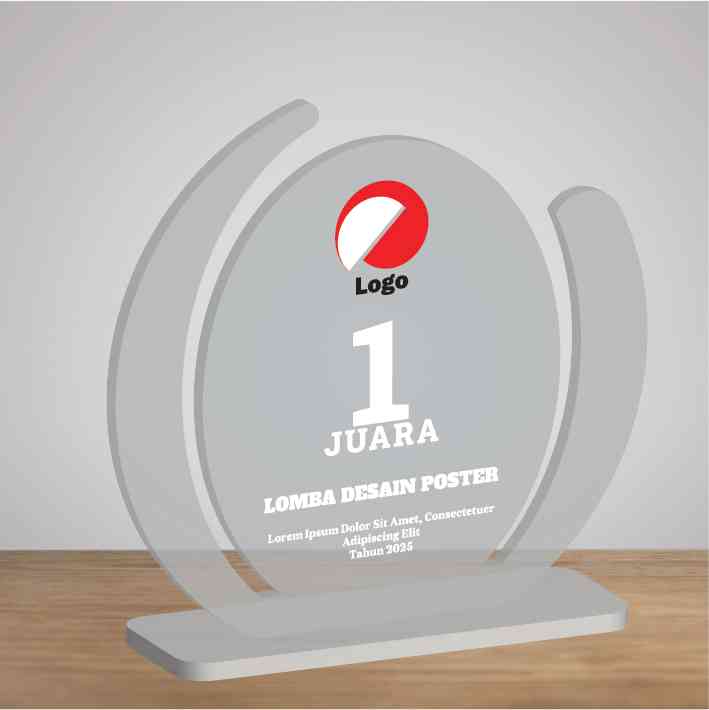 Plakat penghargaan dengan desain elegan berbahan akrilik transparan, menampilkan bentuk unik dengan elemen grafis modern. Diberikan sebagai trofi juar...