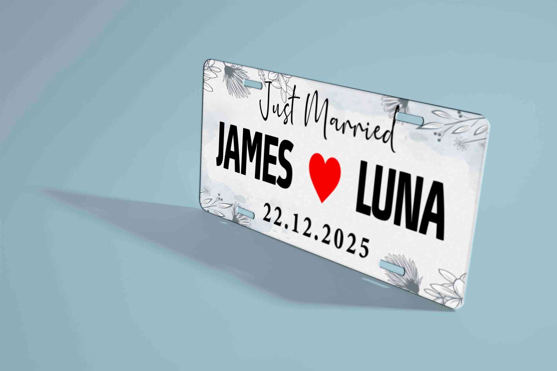 Plat mobil wedding ini mengusung gaya floral vintage dengan sentuhan warna coklat pastel yang hangat dan romantis. Tulisan “Just Married” di bagian atas dipadukan dengan nama pasangan “Your Mr ❤️ Your Mrs” yang menonjol di tengah, melambangkan cinta dan kebersamaan yang baru dimulai. Dihiasi bunga lembut di sisi kiri dan kanan, desain ini memberi kesan klasik namun tetap modern. Cocok sebagai dekorasi mobil pengantin, properti foto, maupun simbol cinta abadi di hari bahagia Anda.