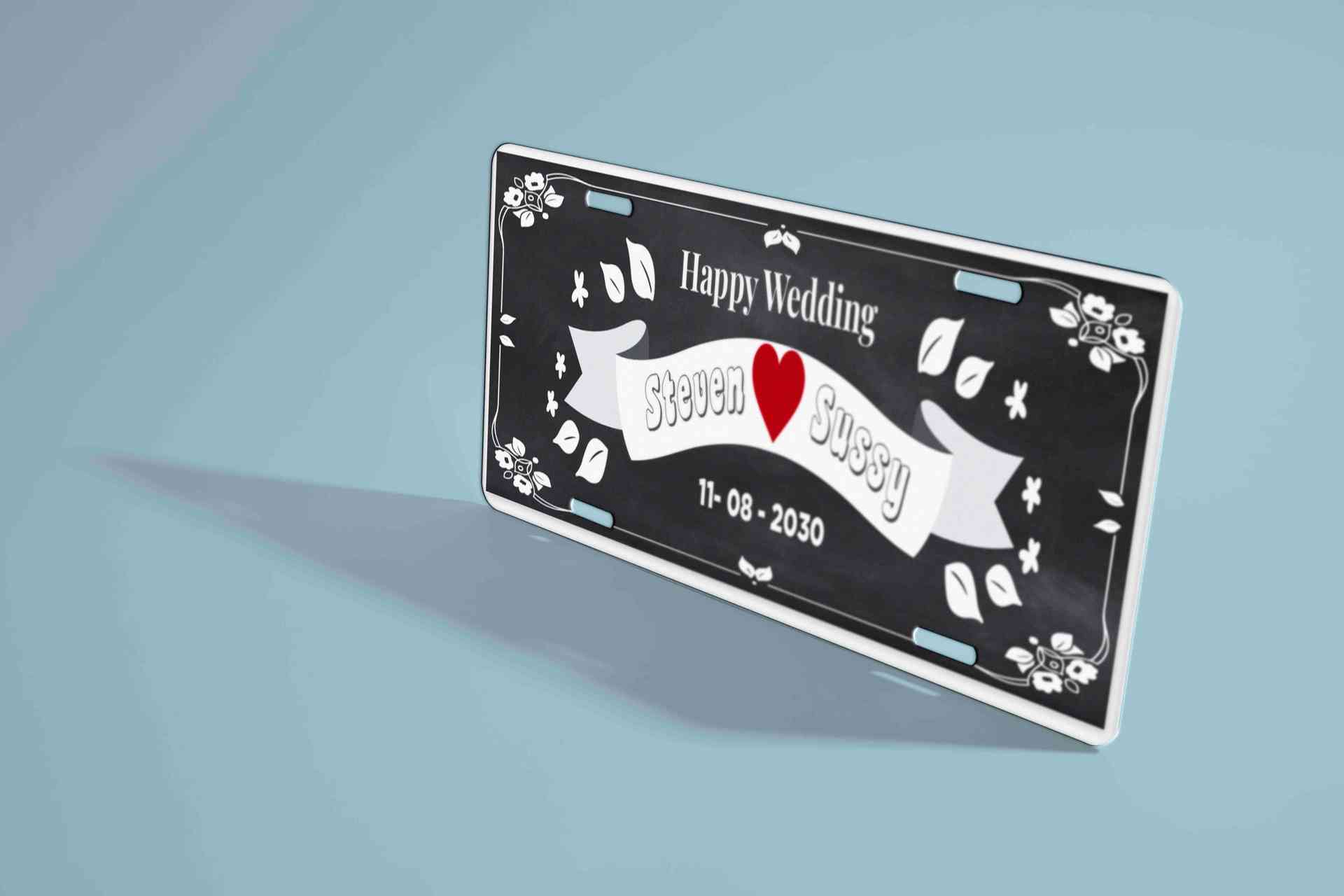Plat dekorasi pernikahan ini hadir dengan desain minimalis namun tetap manis berkat sentuhan bunga pink besar di kedua sisi. Tulisan "Happy Wedding" ditampilkan dengan gaya handwriting yang elegan di bagian atas, sementara nama pasangan “Putra ❤️ Putrie” dicetak dengan font tebal warna hitam yang kontras dan mencolok. Di bagian bawah terdapat tanggal pernikahan “11-08-2030” yang dicetak jelas dalam format numerik tegas. Latar putih bersih memperkuat kesan simpel namun elegan, ditambah elemen bunga bergaya sketsa lembut yang memberi sentuhan romantis. Plat ini sangat cocok sebagai aksesori mobil pengantin atau dekorasi pelengkap momen spesial.
