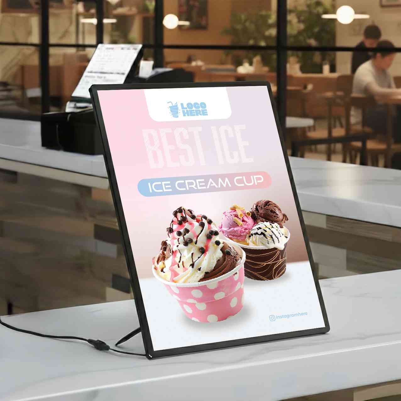 Slim LED Menu Ice Cream Cup Variant Rasa Dengan Pink Soft merupakan papan menu LED berbentuk ramping dengan bingkai hitam dan visual mencolok berupa i...