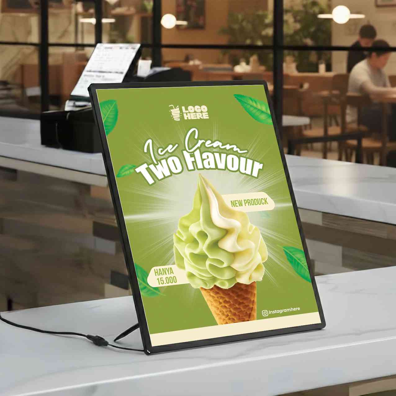 Slim LED Menu dengan tema Ice Cream Cone 2 Rasa ini berbentuk persegi panjang ramping dengan tampilan visual yang mencolok, menampilkan gambar soft ic...