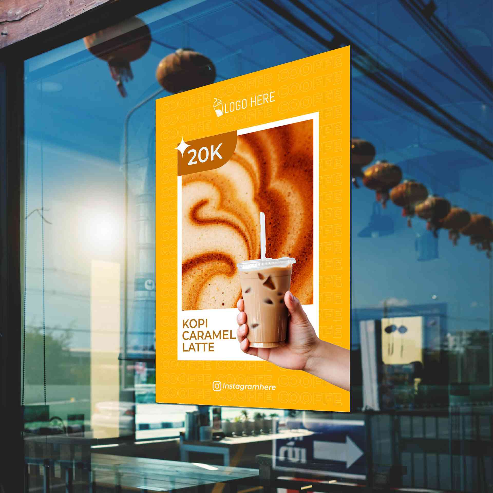 Poster promo minuman kopi caramel memiliki bentuk persegi dengan dominasi warna kuning dan coklat yang mencolok, menampilkan visual swirl latte art be...