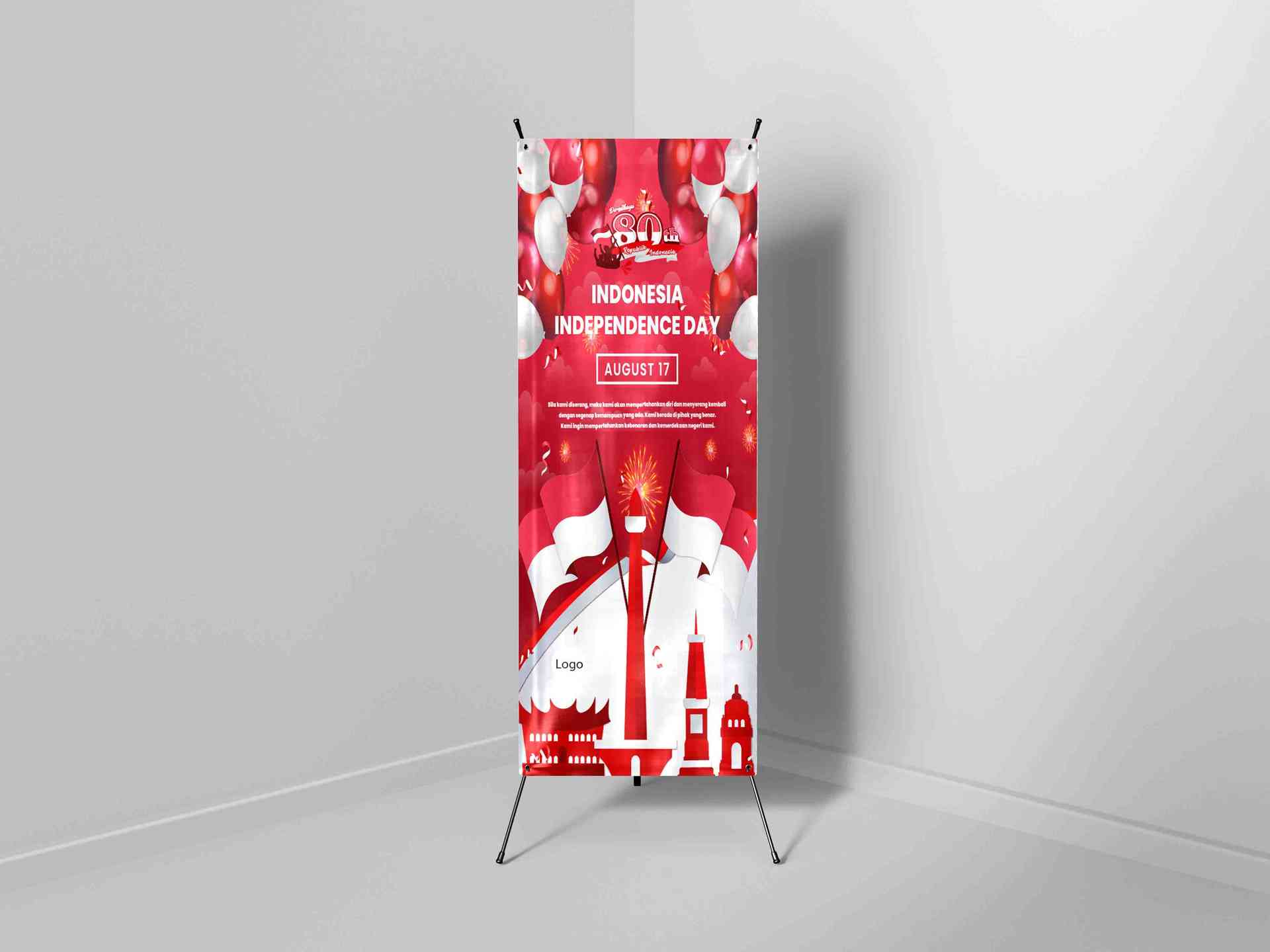 Roll up banner ini sangat cocok untuk event resmi seperti upacara instansi, perusahaan, gedung pemerintahan, maupun acara sekolah. Gaya visualnya yang rapi dan simetris menjadikan banner ini ideal sebagai elemen dekorasi utama untuk memperingati 80 tahun kemerdekaan Republik Indonesia secara berkelas dan membanggakan.