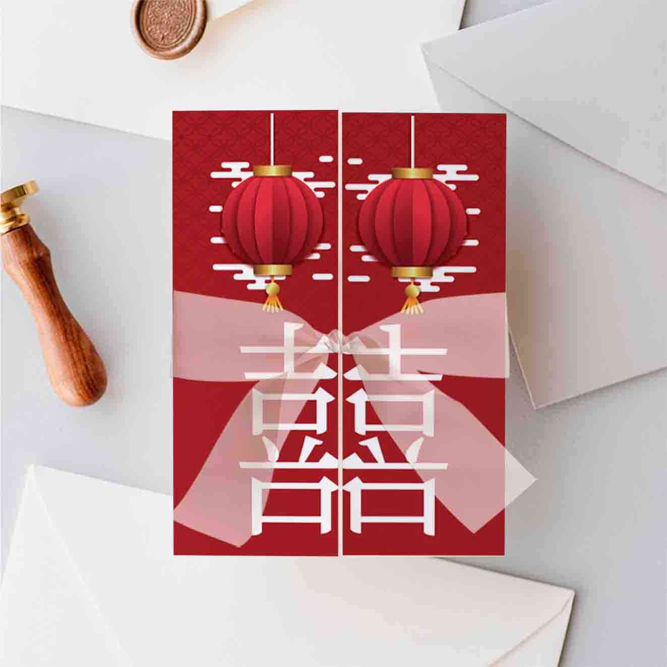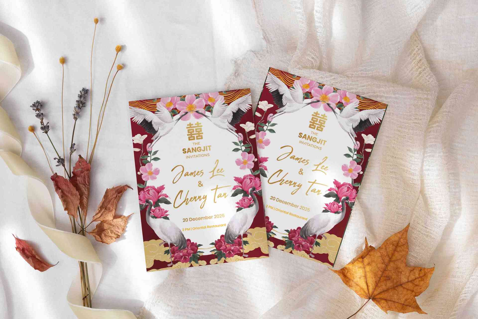 Desain undangan sangjit ini menampilkan nuansa oriental yang elegan dan klasik dengan dominasi warna merah, putih, dan emas. Di bagian tengah terdapat simbol Double Happiness (囍) yang ikonik dalam tradisi Tionghoa, melambangkan kebahagiaan dan keberuntungan dalam pernikahan. Dihiasi dengan motif bunga dan daun berwarna merah dan krem yang membingkai sisi kanan dan kiri, memberikan kesan mewah namun tetap lembut.