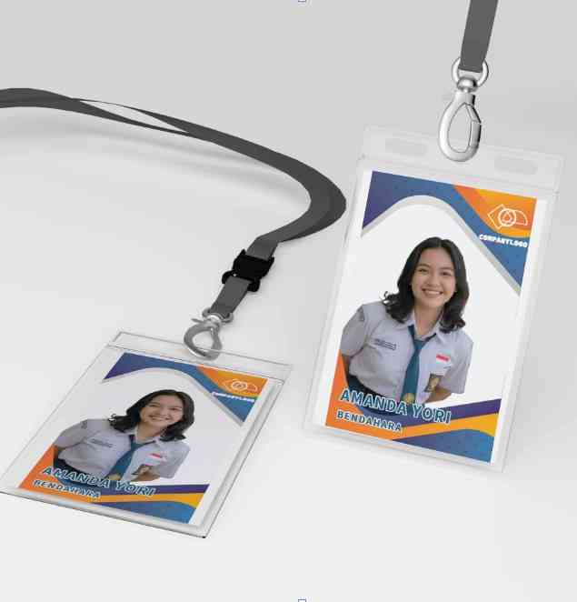 ID Card berbentuk persegi panjang dengan sudut membulat, menampilkan desain geometris yang dinamis dengan kombinasi warna kontras biru, oranye, dan pu...