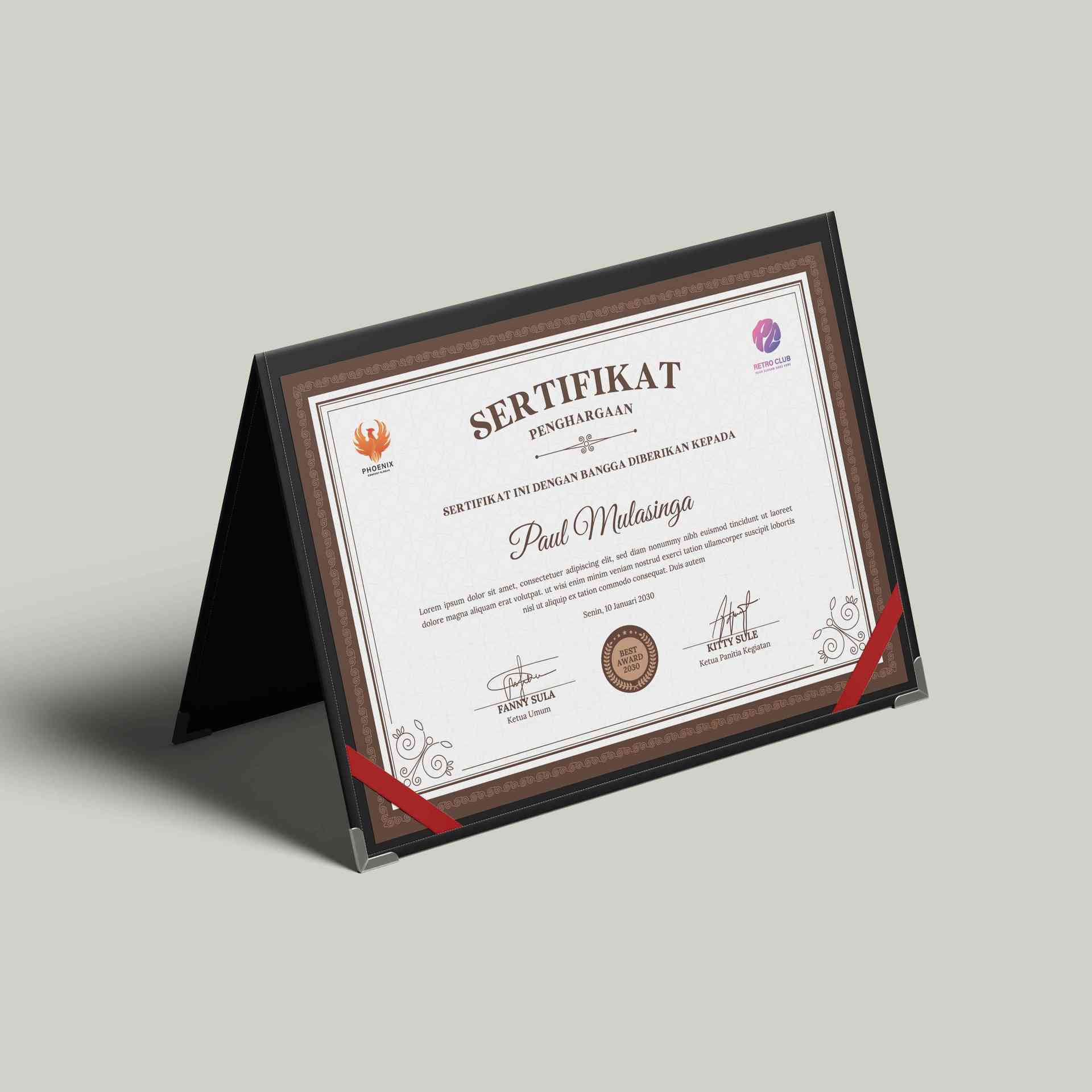 Sertifikat ini hadir dengan tampilan yang klasik, mewah, dan elegan β¨ berkat balutan bingkai motif cokelat bergaya vintage yang langsung memberikan ke...