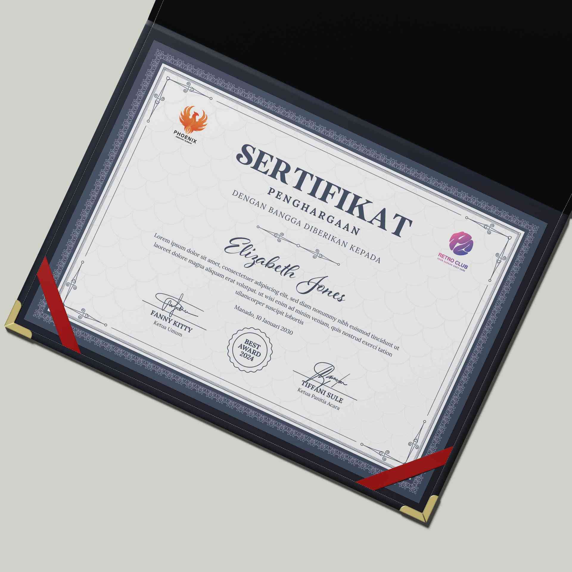 Sertifikat ini tampil dengan desain yang anggun dan resmi, dibingkai motif khas biru tua yang memberi kesan mewah, formal, dan sangat cocok digunakan...