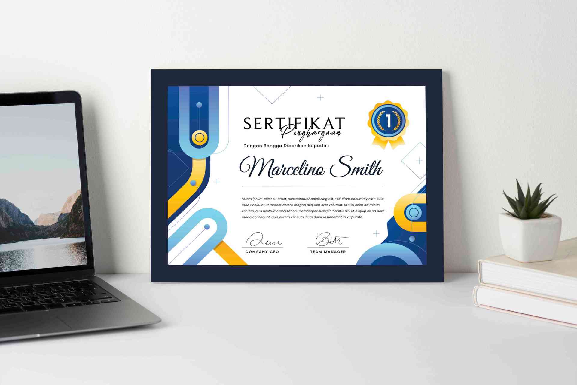 Desain sertifikat penghargaan ini menampilkan gaya modern dengan komposisi visual yang dinamis dan warna-warna tegas seperti biru, kuning, dan putih....