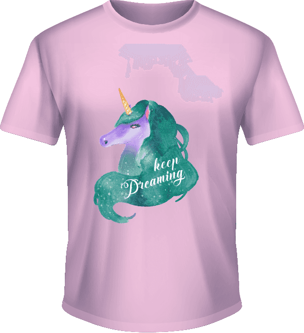 Kaos ini menampilkan desain unicorn bergaya lukisan watercolor yang anggun dengan gradasi warna ungu dan hijau zamrud yang memikat. Teks “keep dreamin...