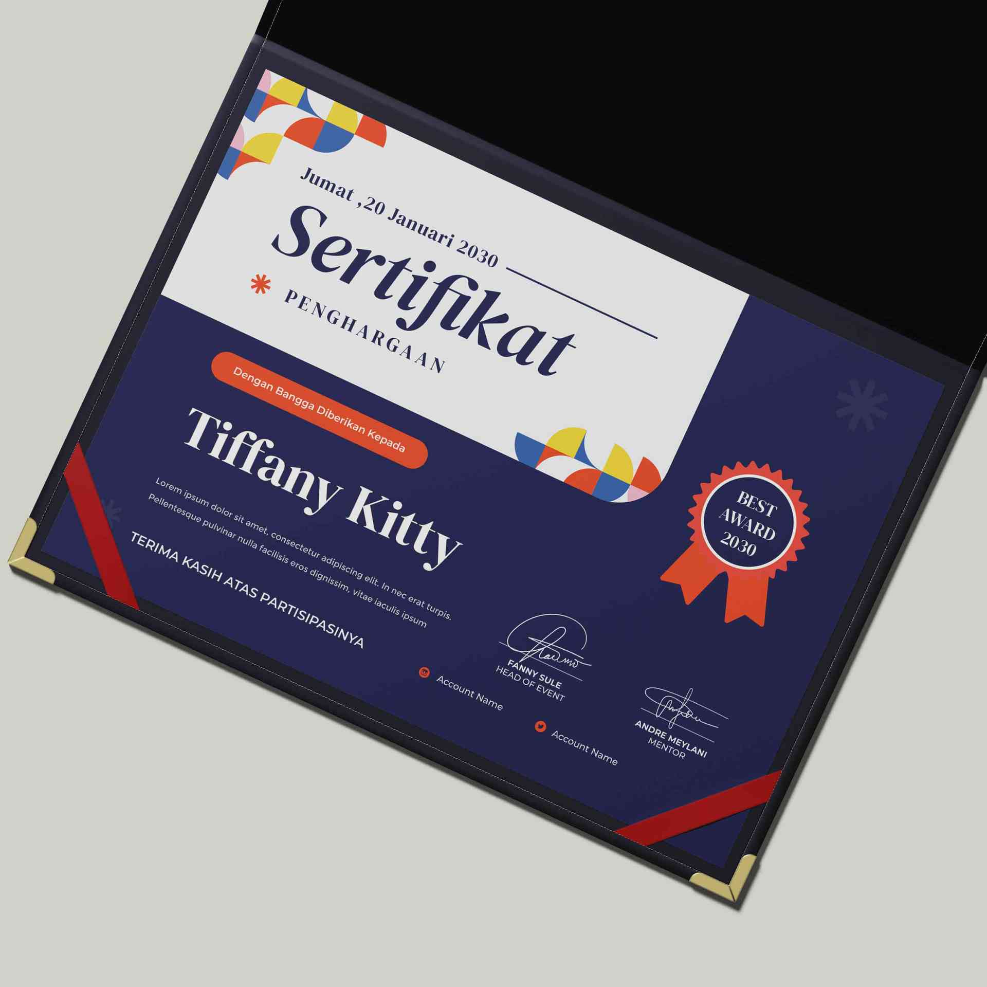 Desain sertifikat ini menampilkan tampilan yang minimalis namun mewah, dengan warna dominan putih dan aksen emas serta navy yang mencerminkan kesan pr...