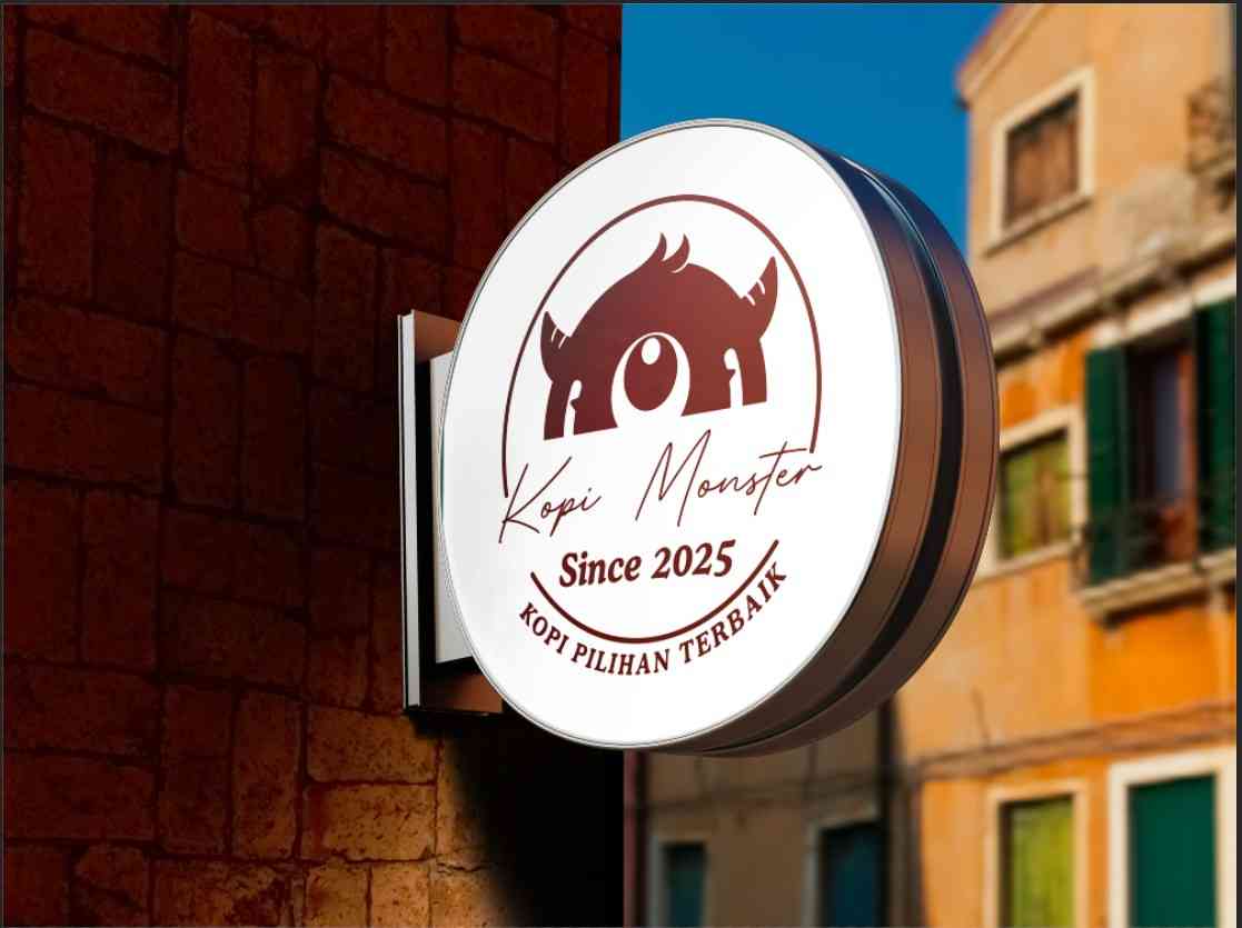Sign box berbentuk bulat dengan dominasi warna putih dan coklat ini menampilkan desain logo bertema karakter monster lucu berwarna coklat, dengan tipo...