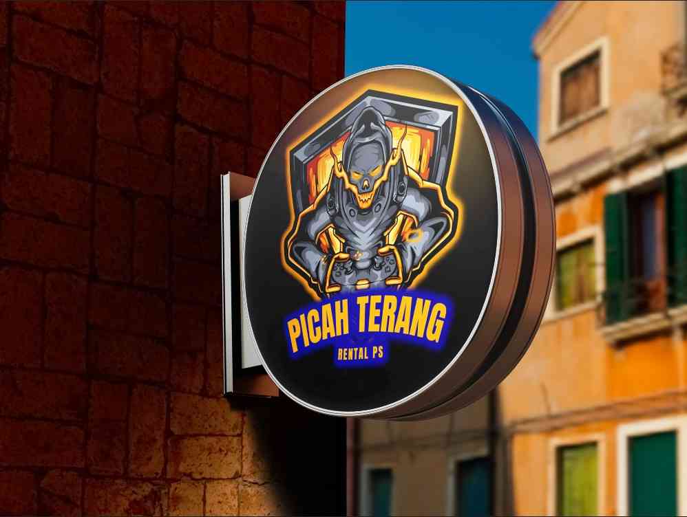 Desain sign box ini menampilkan logo Picah Terang Rental PS dengan ilustrasi karakter grim reaper bertudung abu metalik yang memegang stick controller...