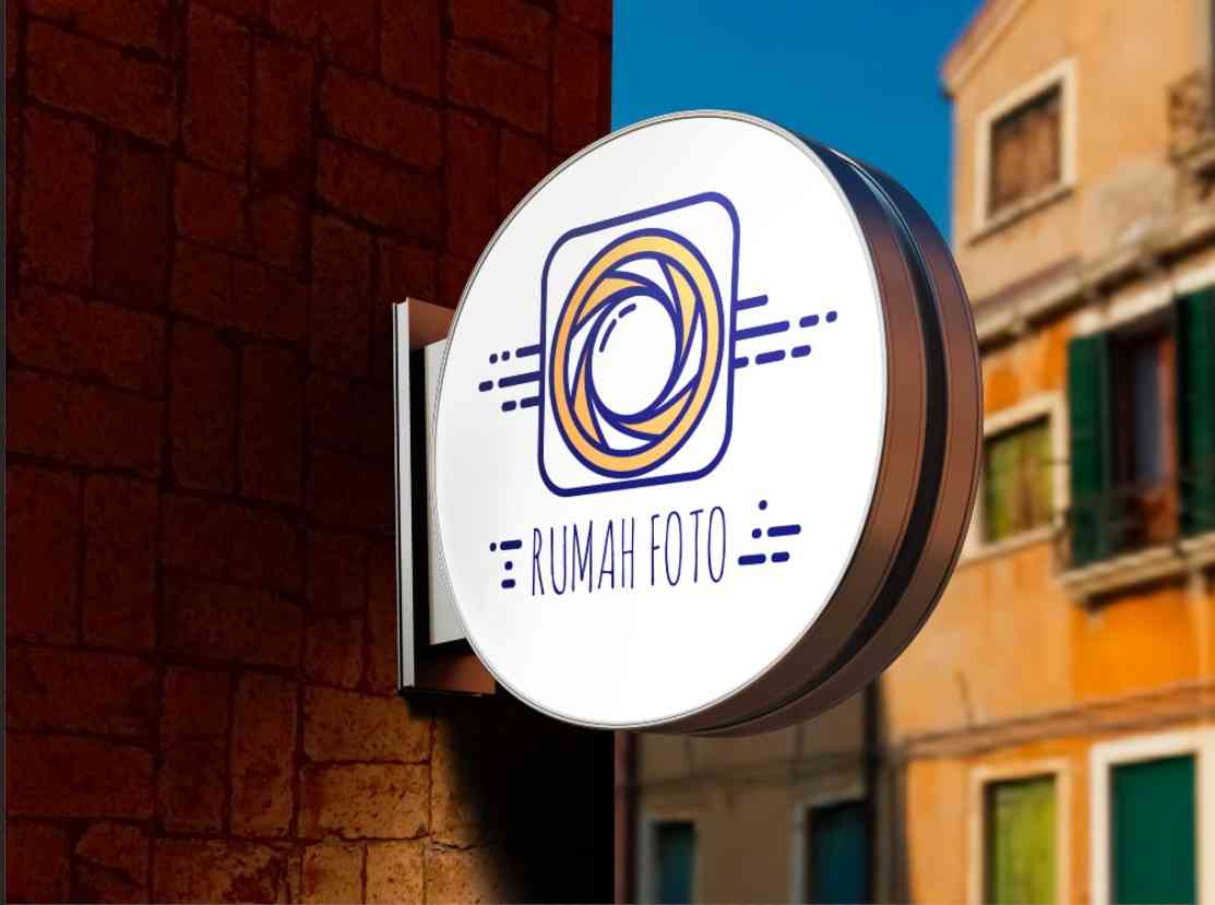 Sign box berbentuk bulat dengan permukaan depan berwarna putih menampilkan logo visual berbentuk lingkaran menyerupai diafragma lensa kamera dalam gar...