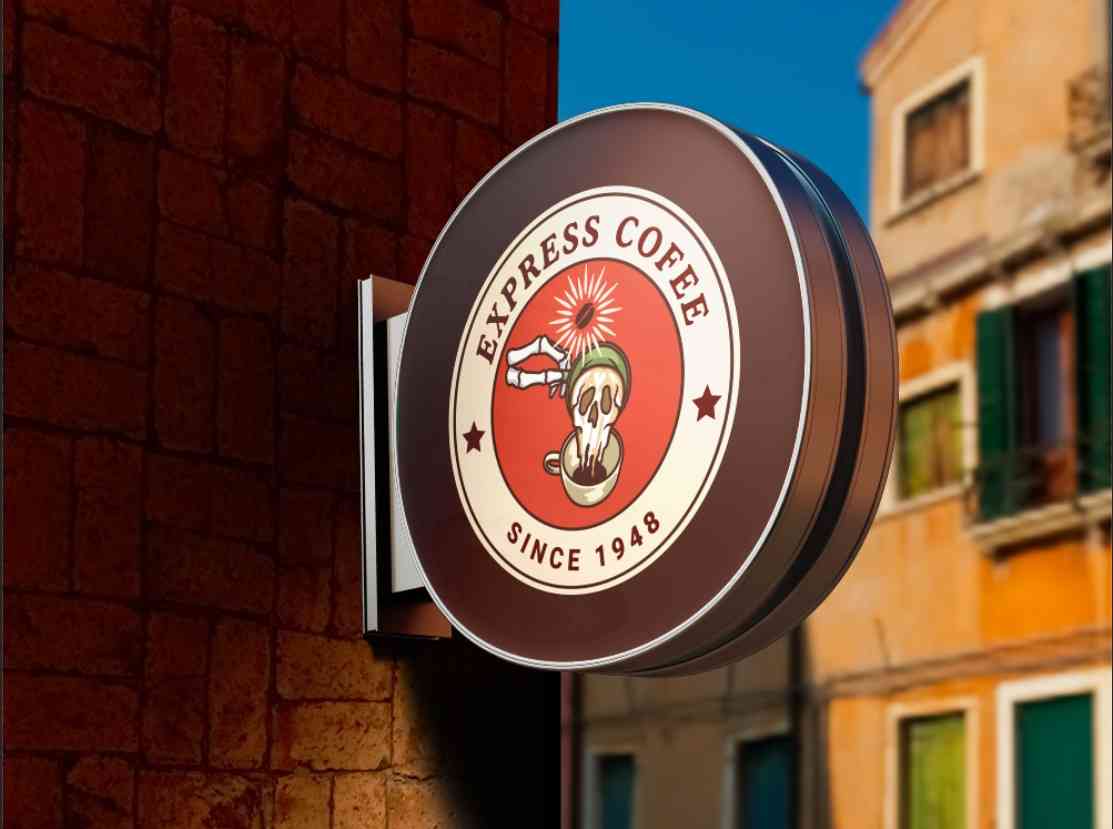 Sign box berbentuk bulat dengan dominasi warna coklat dan aksen krem, menampilkan desain visual bergaya retro yang menonjolkan logo “Express Coffee” s...