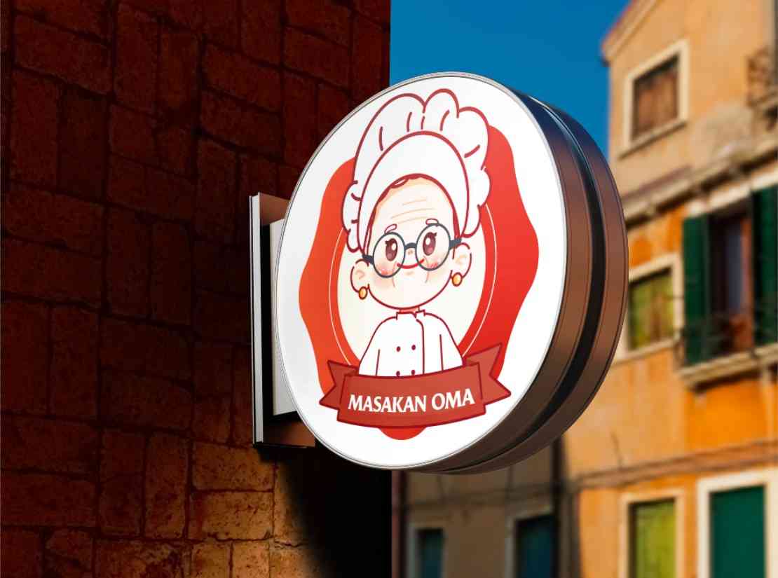 Sign box berbentuk bulat ini menampilkan ilustrasi karakter oma dengan kacamata, baju koki, dan penutup kepala chef, menonjolkan kesan ramah dan homey...