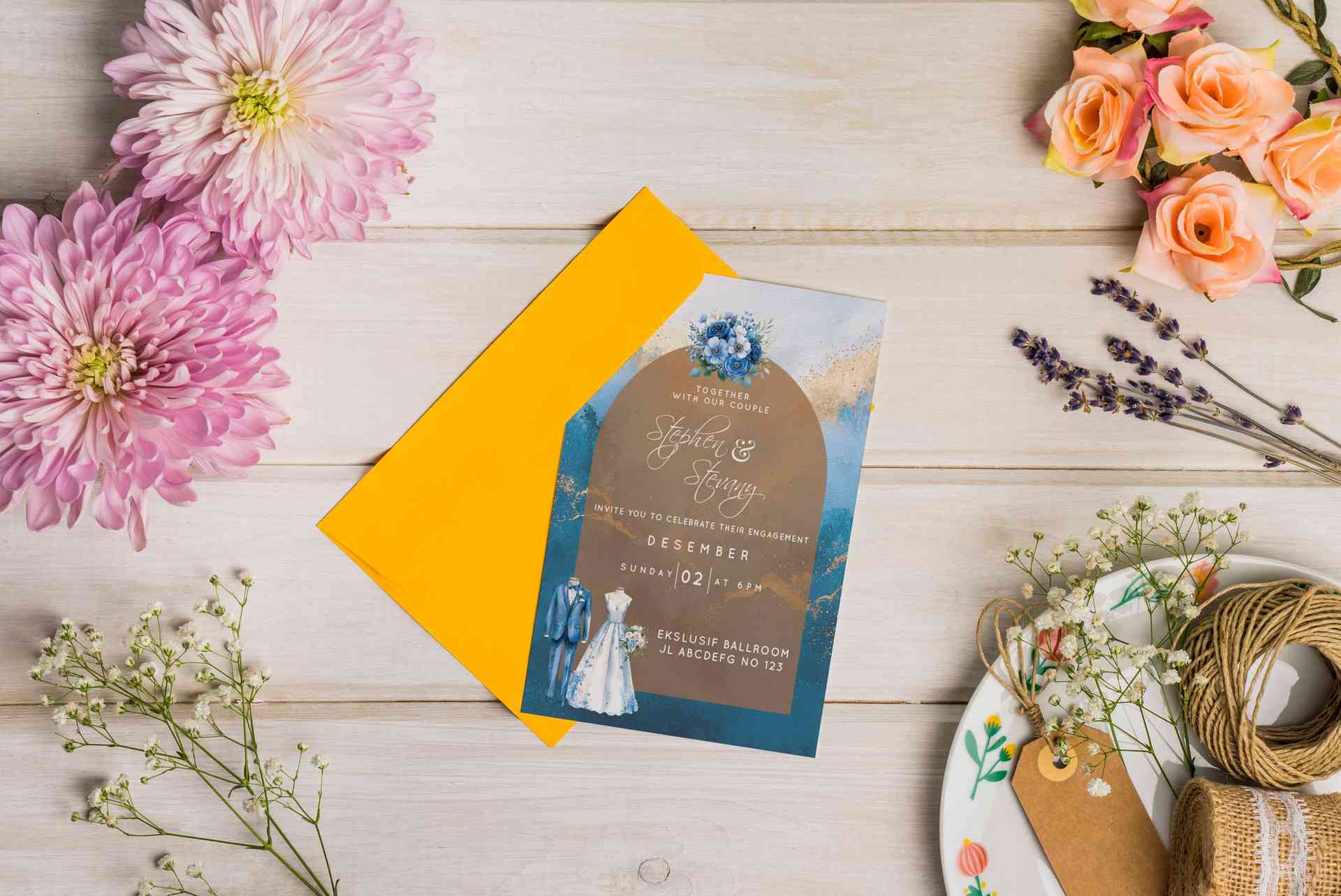 Desain undangan ini mengusung konsep floral rustic yang elegan, memadukan warna biru tua dan coklat emas yang memberi kesan mewah namun tetap hangat....