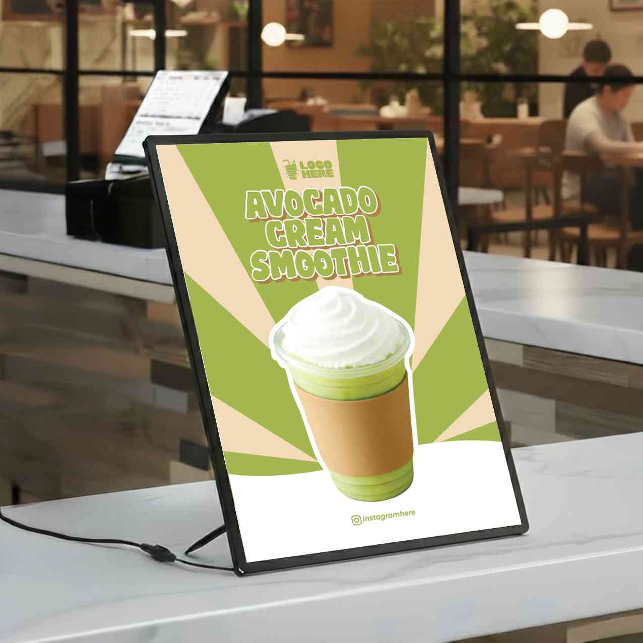 Slim LED Menu Avocado Smoothie menampilkan papan menu elektronik ramping dengan bentuk persegi panjang, digunakan untuk promosi minuman smoothie alpuk...