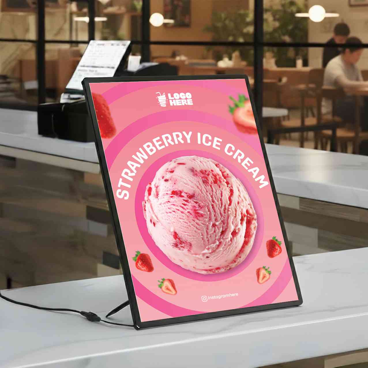 Slim LED Menu dengan tema es krim ini memiliki bentuk persegi panjang dengan desain visual yang menarik, memajang gambar es krim stroberi sebagai kara...
