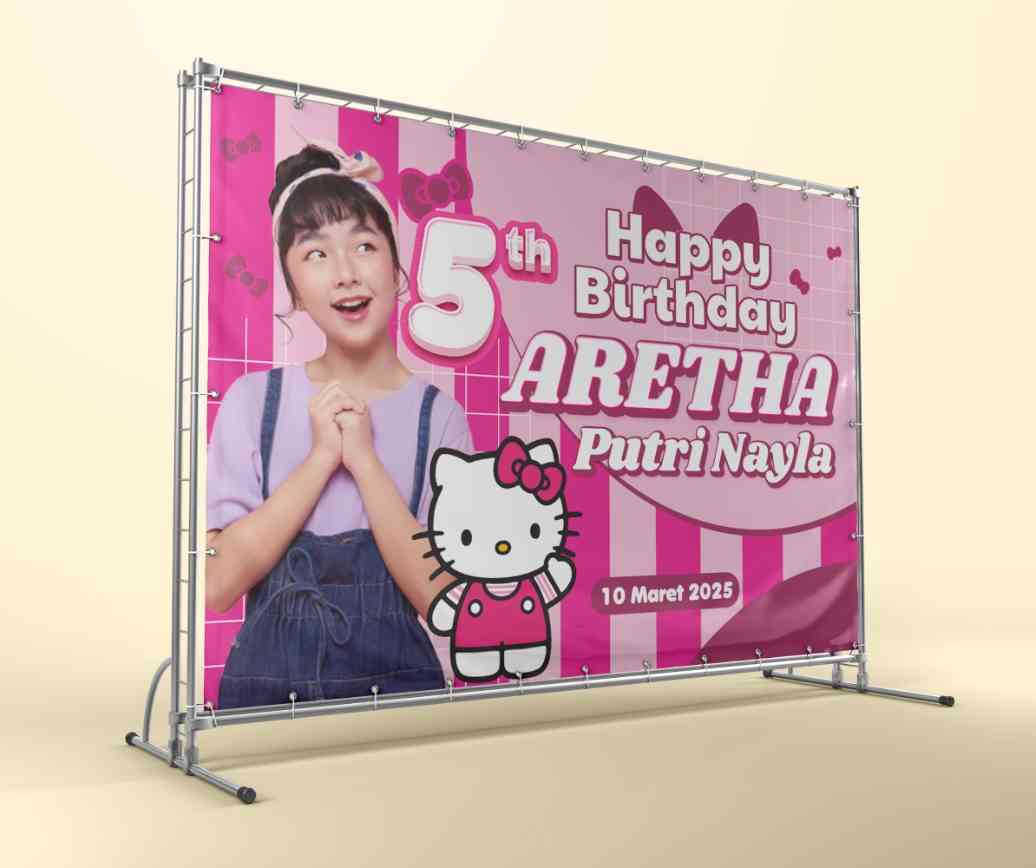 Baliho ulang tahun ini hadir dengan tema Hello Kitty yang manis dan feminin, didominasi warna pink cerah dan ungu pastel. Desainnya penuh keceriaan de...
