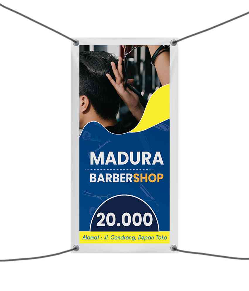 Banner Madura Barber merupakan media promosi berukuran vertikal dengan dominasi warna gelap seperti biru tua dan aksen kuning serta putih. Desain bann...