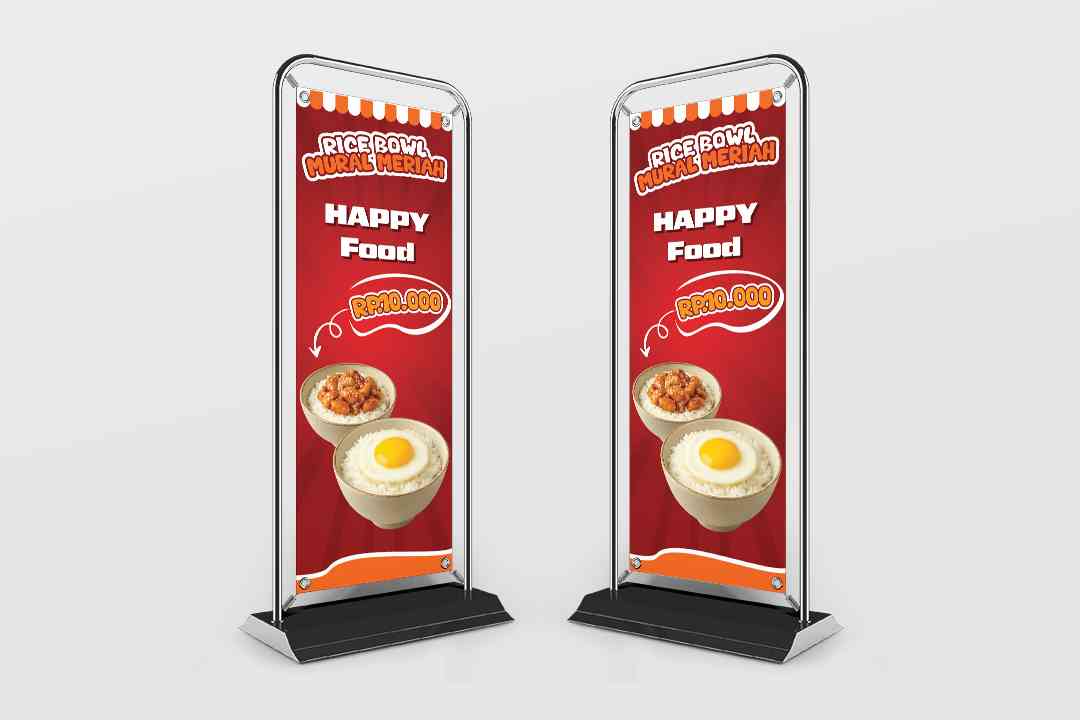 Banner cetak bertema “Rice Bowl Happy Food” ini berbentuk vertikal dengan warna dominan merah dan aksen oranye putih, menampilkan visual dua mangkuk r...