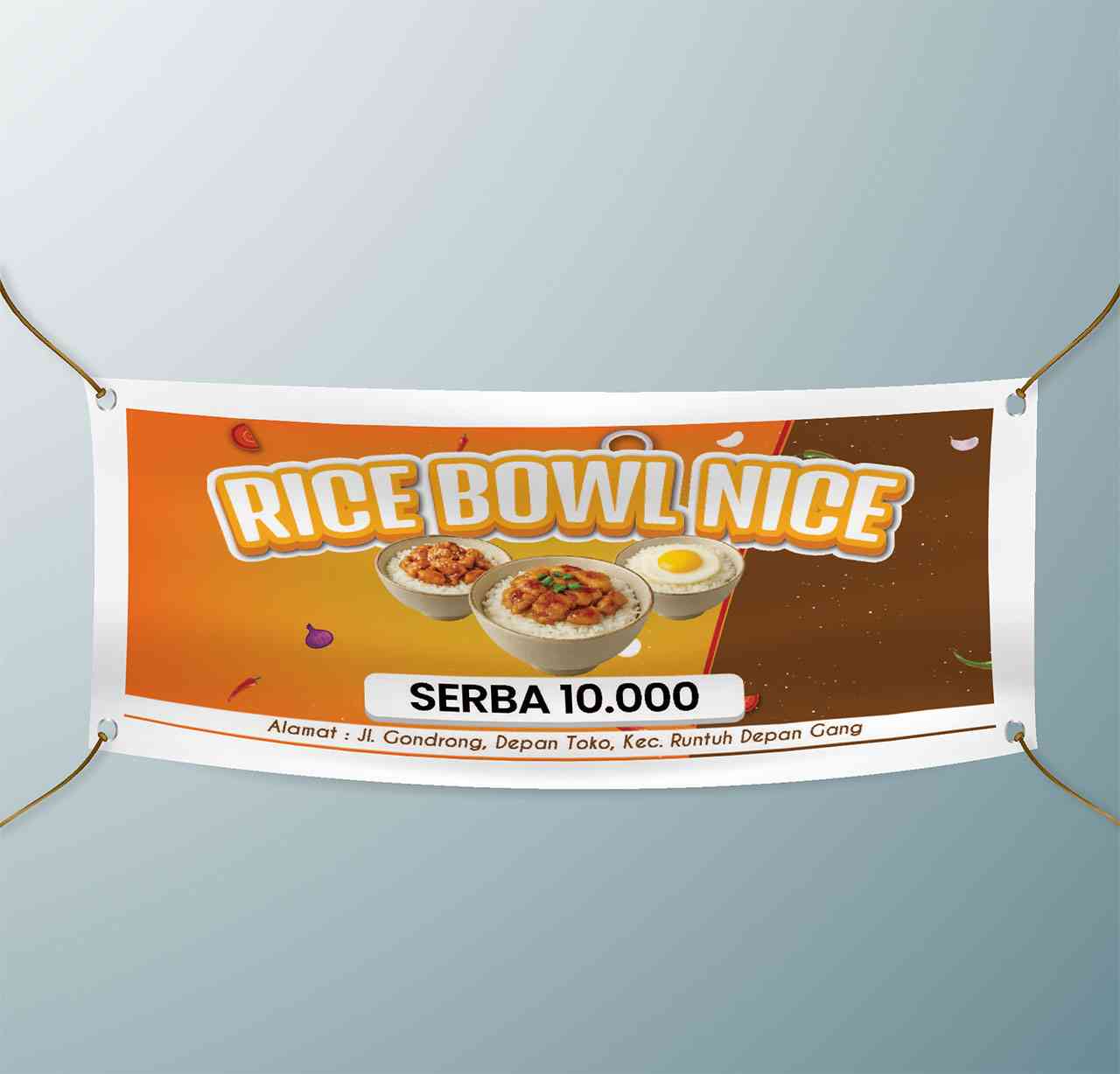 Banner Rice Bowl Nice dengan berbagai menu pilihan seharga 10K, lengkap dengan alamat lokasi yang jelas. Menarik perhatian dengan warna cerah dan desa...