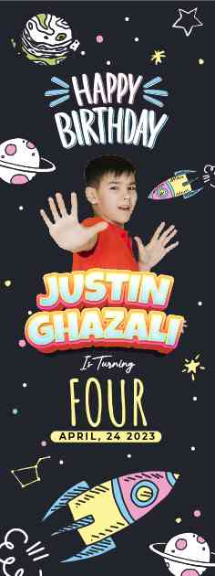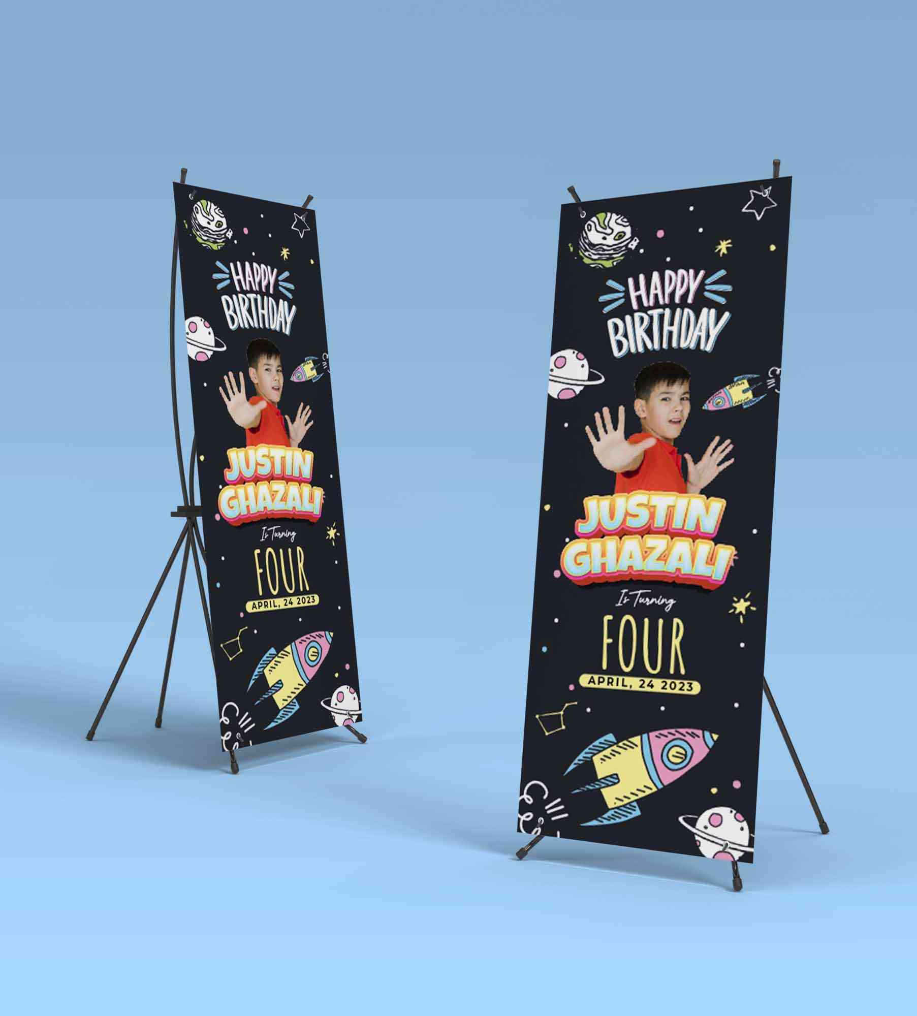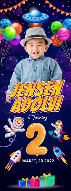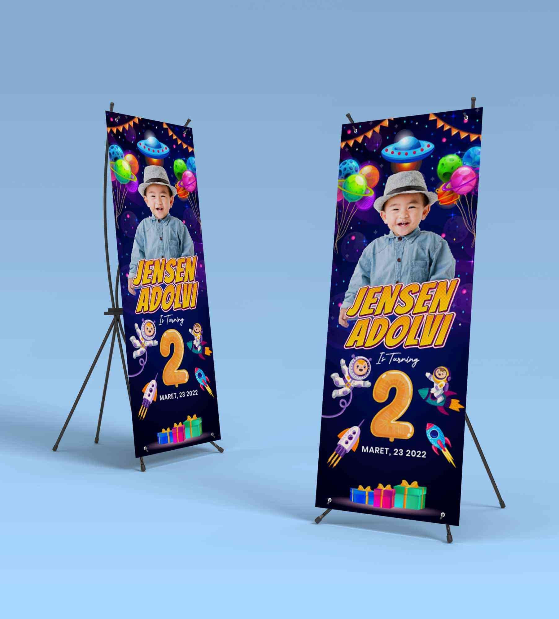Standing banner yang menakjubkan ini dirancang khusus untuk merayakan acara HUT dengan tema NASA. Dengan latar belakang biru mendalam yang melambangkan langit malam, banner ini menampilkan gambaran kosmos yang megah.