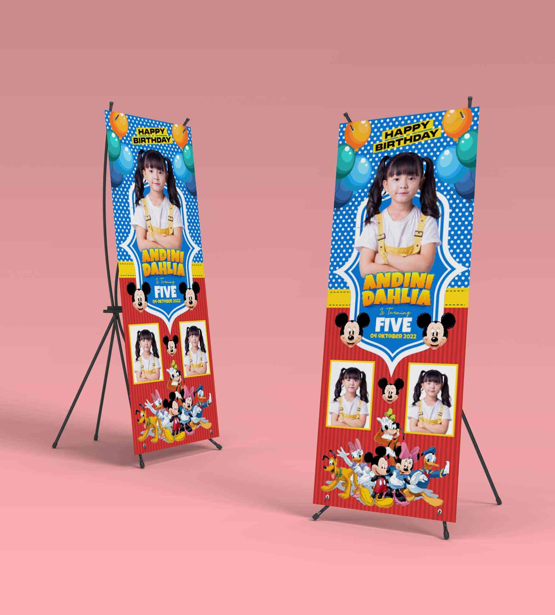 Standing banner yang ceria ini menampilkan gambar besar Mickey Mouse dengan senyum lebar dan balon-balon bertema Mickey yang melayang di sekitarnya. M...