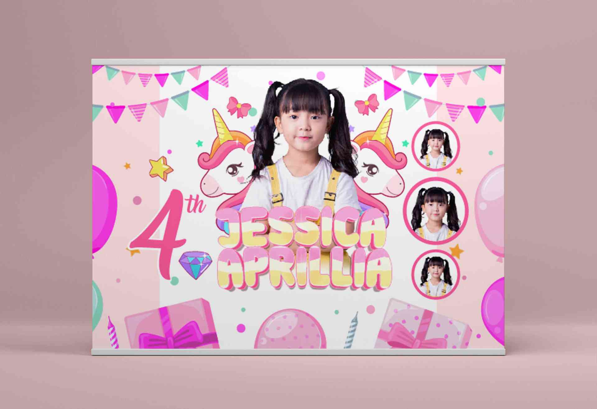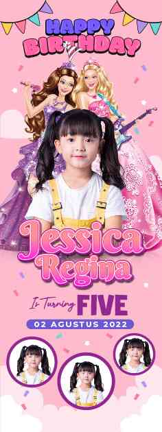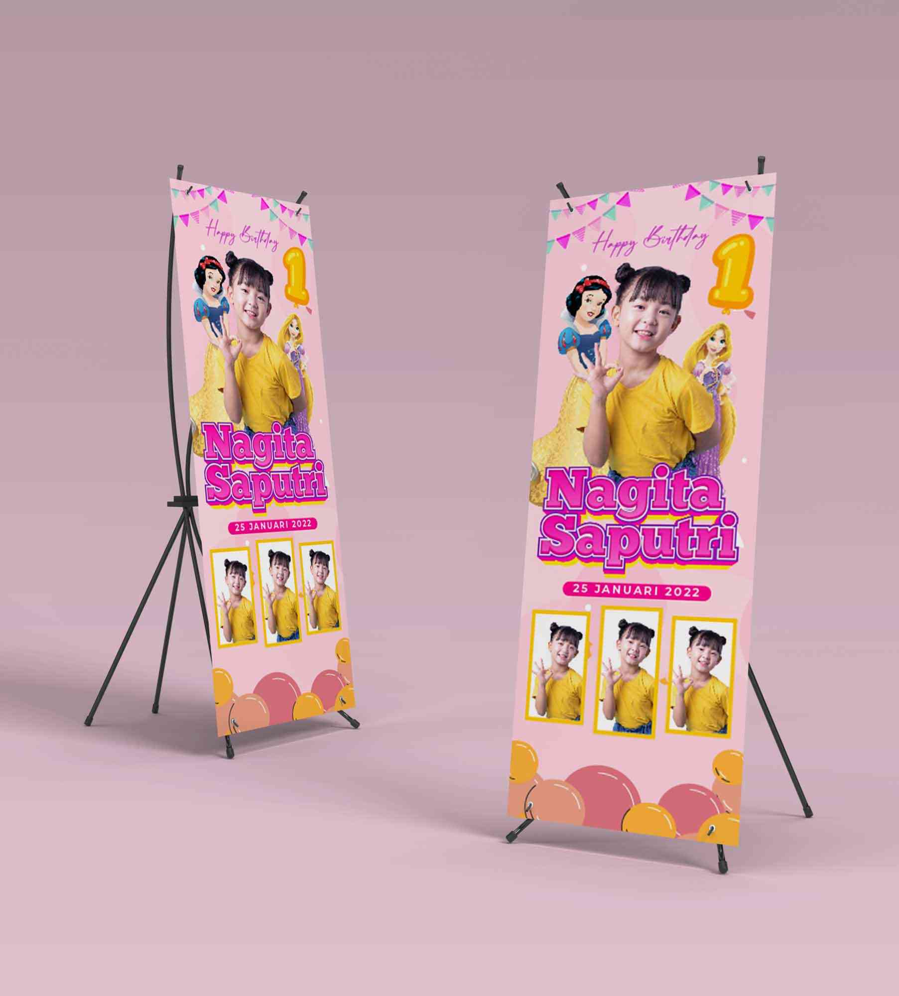 Spanduk berdiri ini adalah pintu gerbang menuju dunia dongeng yang memikat, di mana keajaiban dan keanggunan bertemu dalam perayaan ulang tahun seorang putri. Di tengah-tengah spanduk, tergambar seorang putri muda yang tersenyum manis, mengenakan gaun yang anggun dengan detail-detail berkilauan yang mempesona. Di sekelilingnya, istana-istana megah dan kebun-kebun bunga yang indah memberikan latar belakang yang mengesankan.
