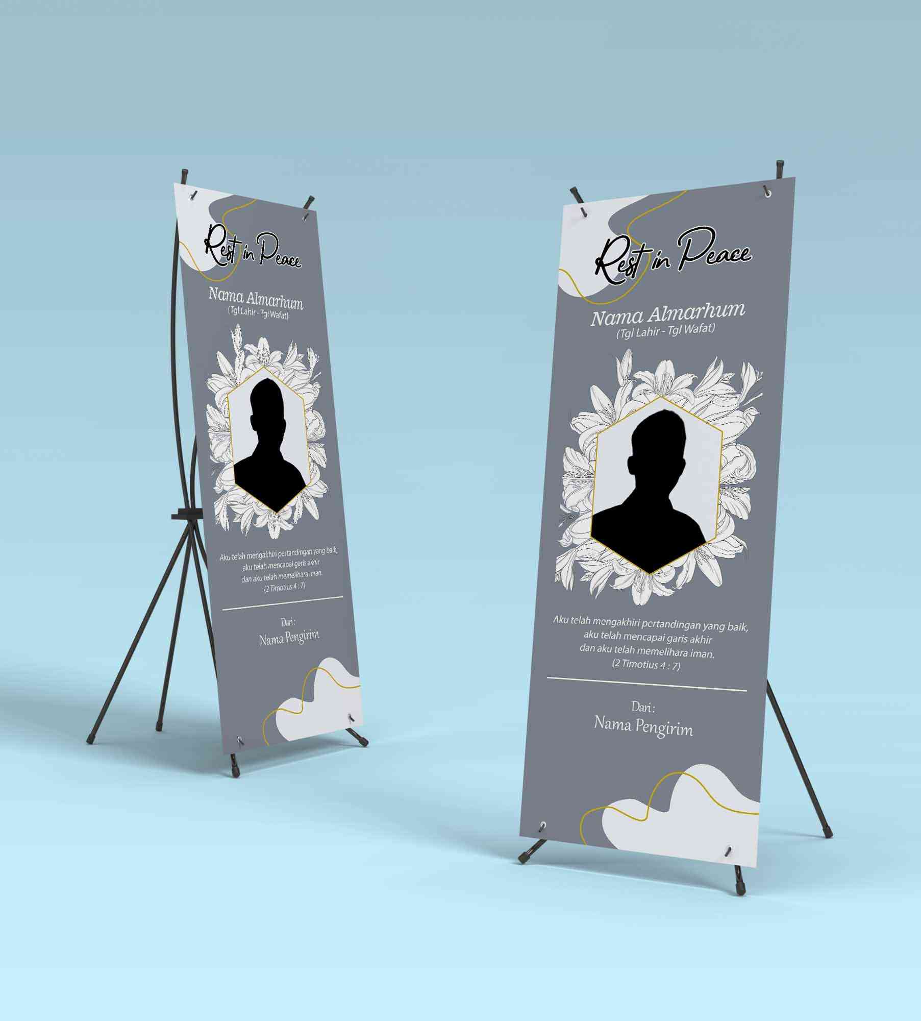 Tema "Kedamaian Abadi" mengusung nuansa yang tenang dan penuh penghormatan untuk mengenang kepergian seseorang dengan elegan dan damai. Banner ini dirancang untuk menciptakan suasana yang menghibur sekaligus penuh ketenangan, mencerminkan rasa duka cita yang mendalam dan doa untuk kedamaian abadi bagi almarhum/almarhumah.