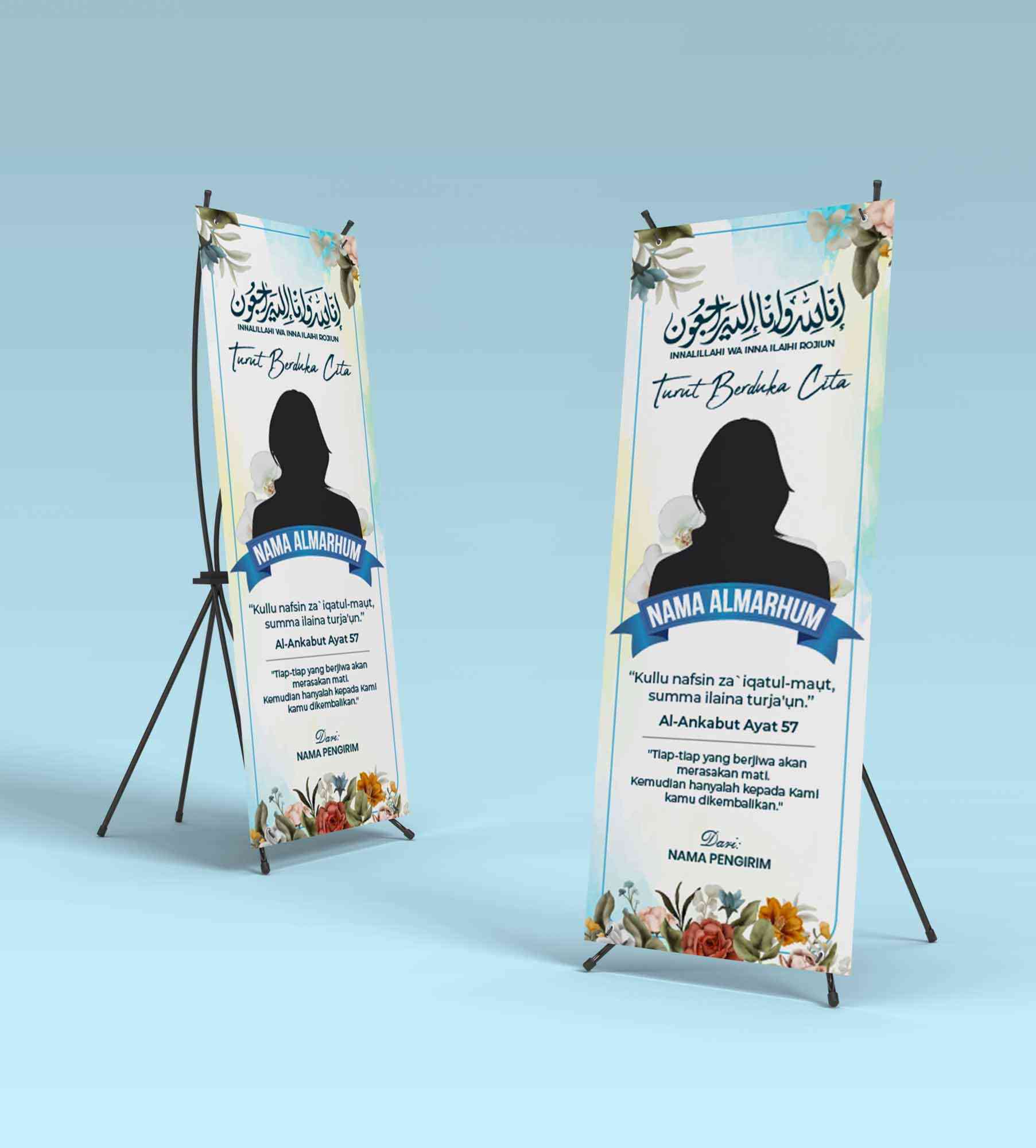 Tema "Kedamaian Abadi" mengusung nuansa yang tenang dan penuh penghormatan untuk mengenang kepergian seseorang dengan elegan dan damai. Banner ini dirancang untuk menciptakan suasana yang menghibur sekaligus penuh ketenangan, mencerminkan rasa duka cita yang mendalam dan doa untuk kedamaian abadi bagi almarhum/almarhumah.