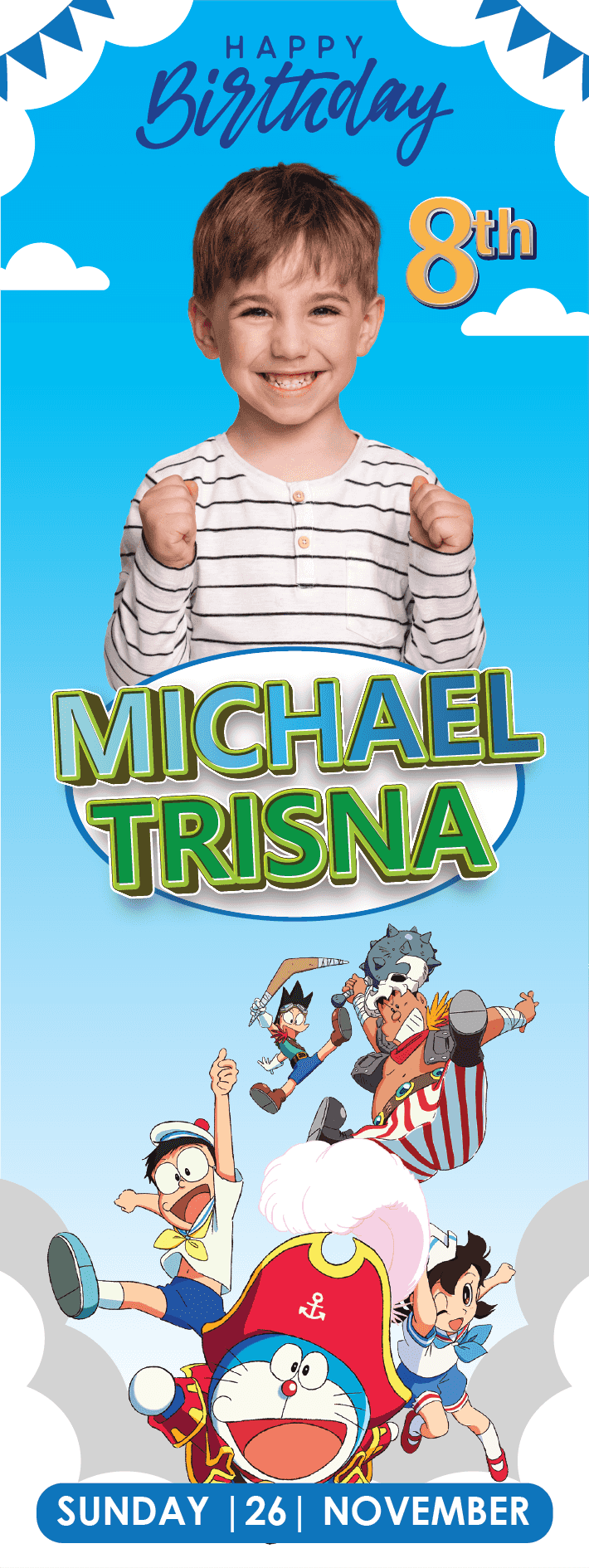 Banner ulang tahun ini adalah perayaan yang ceria dan menggemaskan, menghadirkan pesona dan keajaiban dari karakter Doraemon dalam setiap detilnya. De...